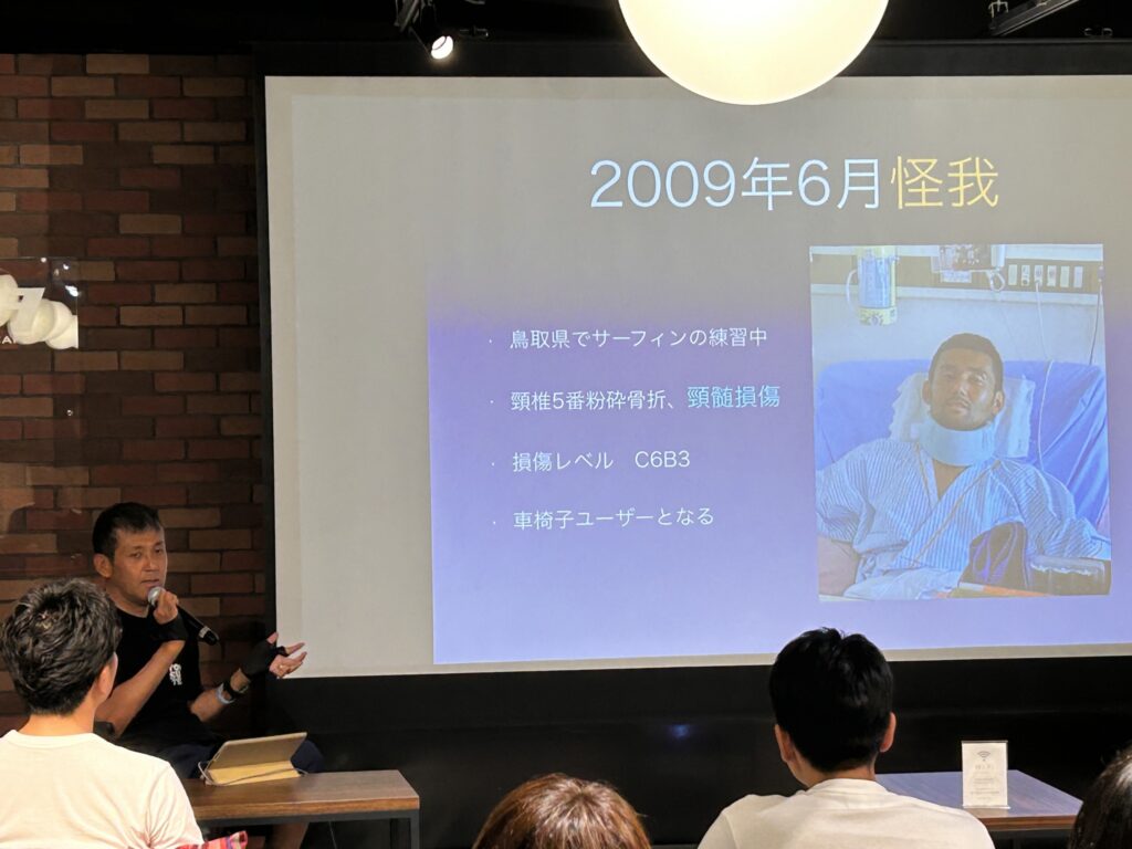 ・2009年頸髄損傷。車椅子ユーザーとなるも、サーフィンを再開。